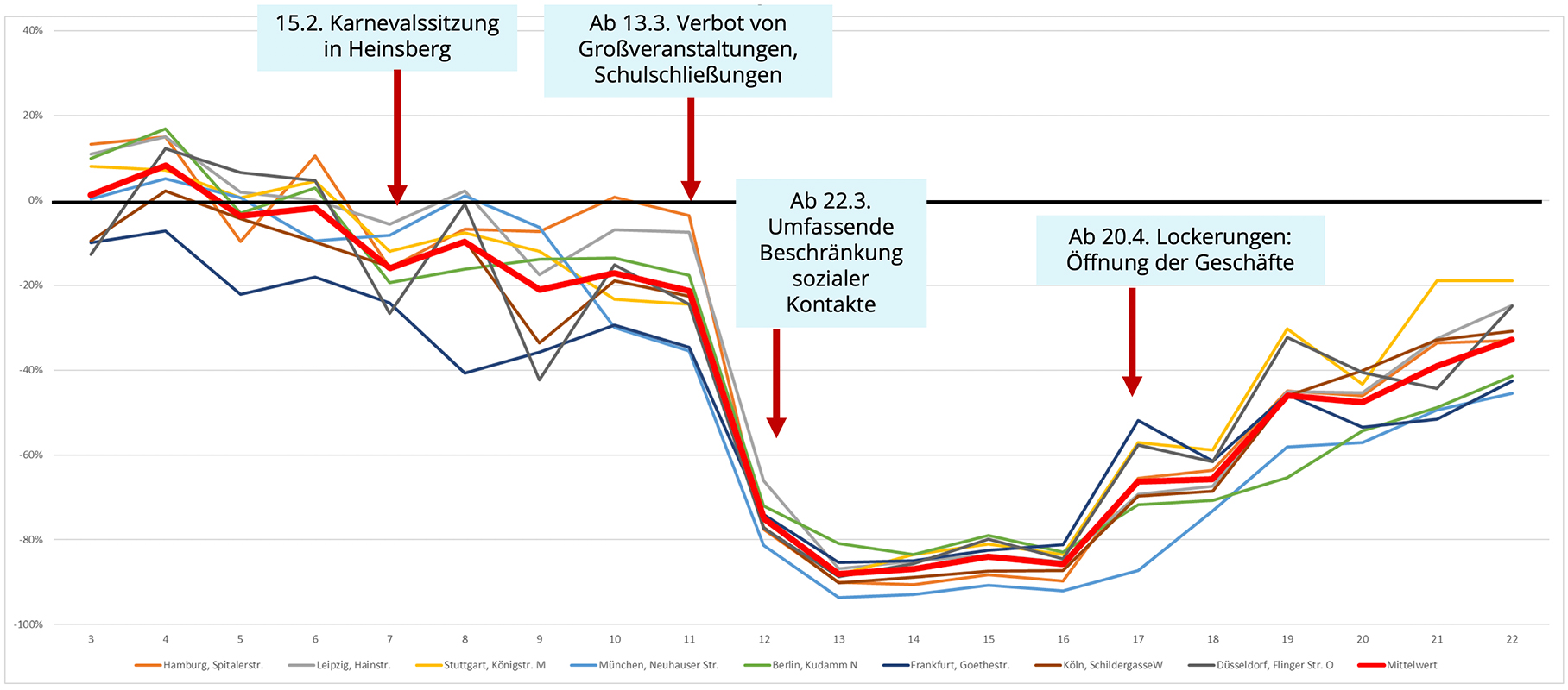 *Anmerkung: Interessant ist auch, dass die Frequenzen bereits im Februar 10 bis 22% unter den Vorjahreswerten lagen mit sinkender Tendenz. Hier liegt die Vermutung nahe und wäre detaillierter zu untersuchen, inwiefern dies bereits mit einer Corona-bedingten persönlichen Reduzierung der Innenstadtbesuche bzw. den ausbleibenden Touristen aus Asien zu tun hatte.