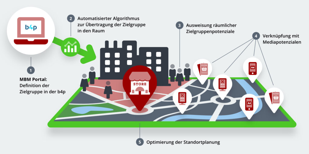 Die einfachste Art, mit dem MBM b4p Locator zu arbeiten, ist die Online-Plattform. Hier definieren Sie Ihre gewünschte Zielgruppe und bestimmen in welcher Form das Ergebnis produziert werden soll. Innerhalb von wenigen Minuten erhalten Sie das gewünschte Ergebnis zurück.